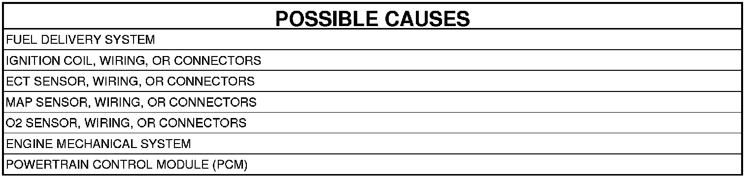 - Poor connector/terminal to component connection for CKP sensor, CMP sensor, MAP sensor, TP sensor, fuel injector, ignition coil, etc.