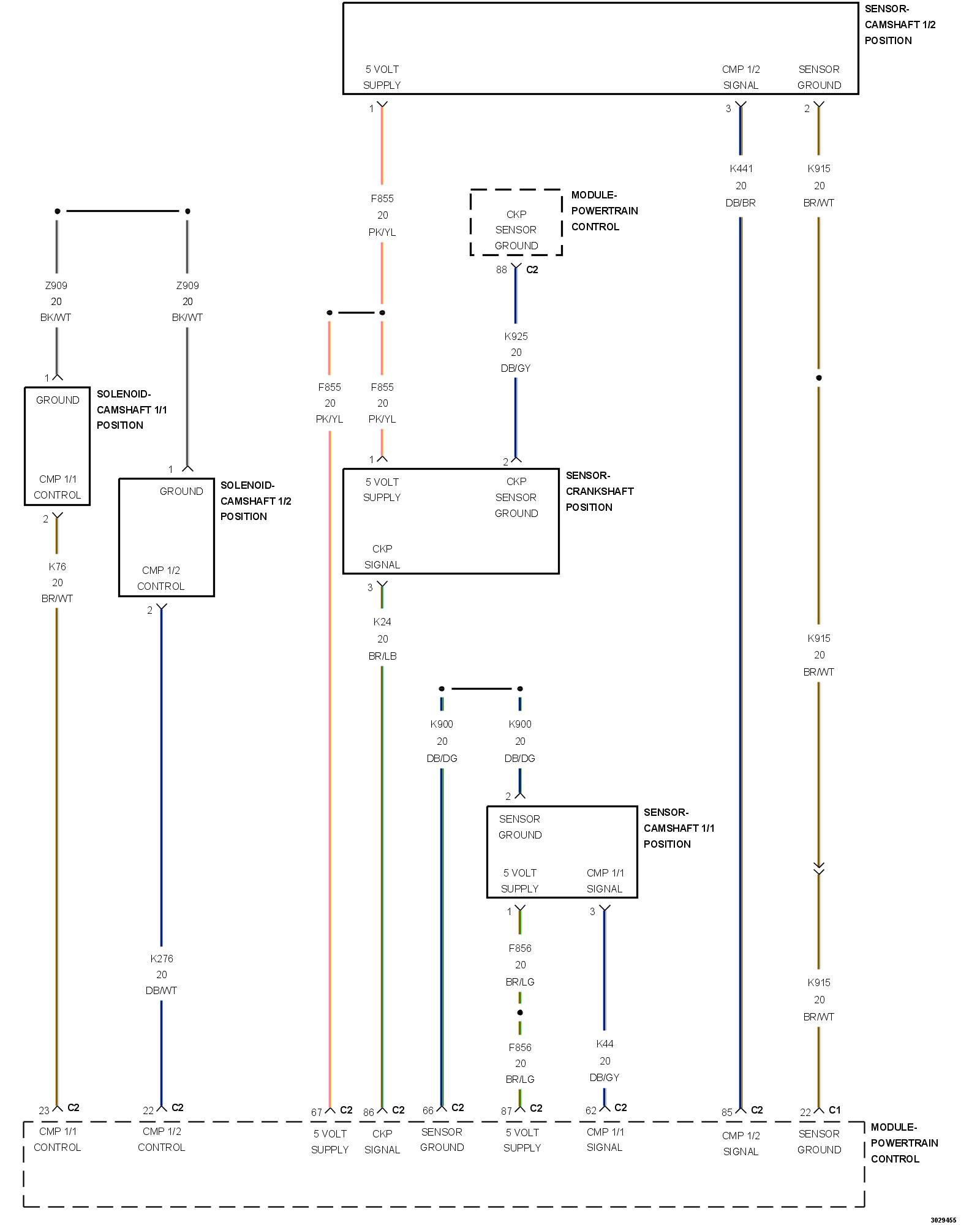 2. Using the wiring diagram/schematic as a guide, inspect the wiring and connectors between the Camshaft 1/2 Position Sensor and the Powertrain Control Module (PCM).