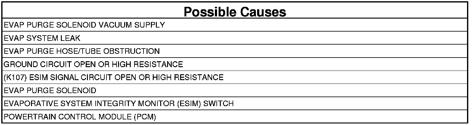 The Evap Purge Monitor tests the integrity of the hoses/tube between the throttle body/intake and the fuel tank. The monitor is a two stage test and runs only after the Evap system passes the small leak test. Stage one is non-intrusive. The Powertrain Control Module (PCM) monitors the purge vapor ratio and the Evaporative System Integrity Monitor (ESIM) Switch closed ratio. If the purge vapor ratio is above a calculated value, the monitor passes. If the ESIM switch closed ratio is greater than calculated value when purge flow is greater than a minimum value, the monitor passes. Stage two is an intrusive test and runs only if stage one does not pass. The PCM commands the purge solenoid to flow at a specified rate to force the purge vapor ratio to update. The ratio is compared to a calibrated specification. If it is less than specified, a one trip failure is recorded. This test can detect if the purge hose is off, obstructed, or the purge valve is not operational.