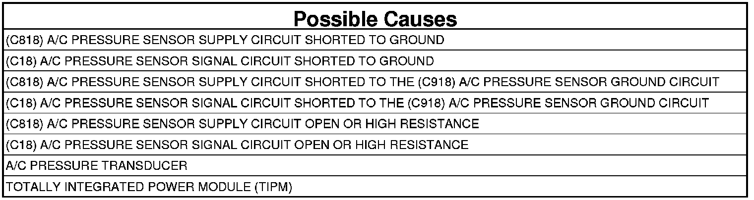 - Repair the (C818) A/C Pressure Sensor Supply circuit for a short to ground.