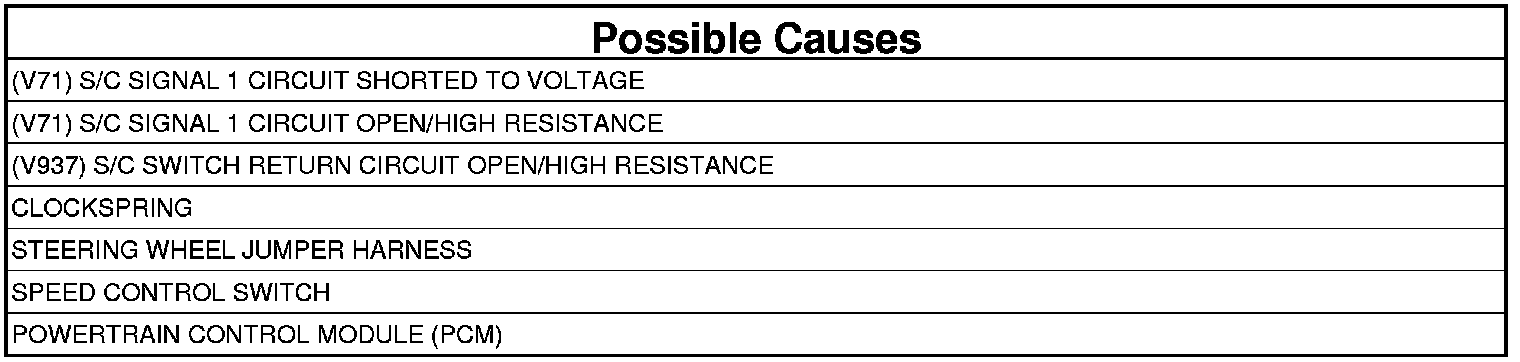 1. Connect a jumper between the (V71) S/C Signal 1 circuit and the (V937) Switch Return circuit at the Speed Control Switch harness connector.