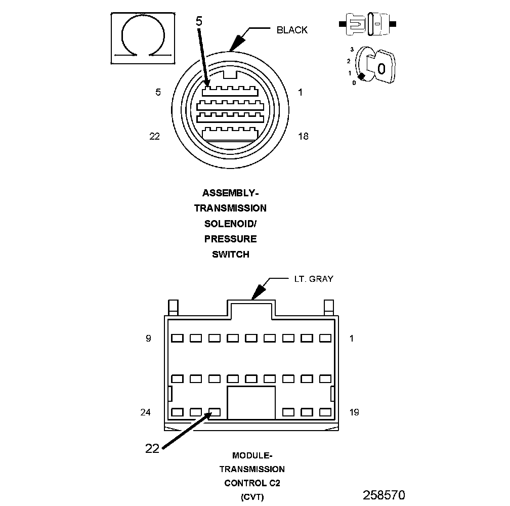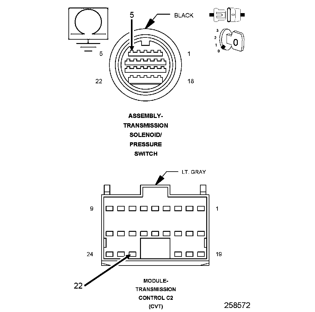 3. Measure the resistance of the (T72) 5-volt Supply circuit between the TCM C2 harness connector and the Transmission Solenoid/Pressure Switch Assembly harness connector.