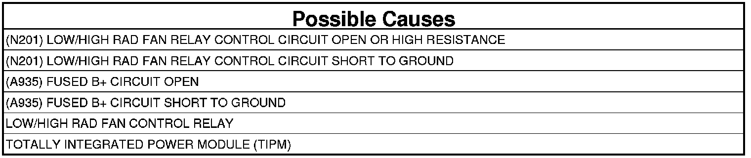 - Repair the short to ground in the (N201) Low/High Rad Fan Control circuit.