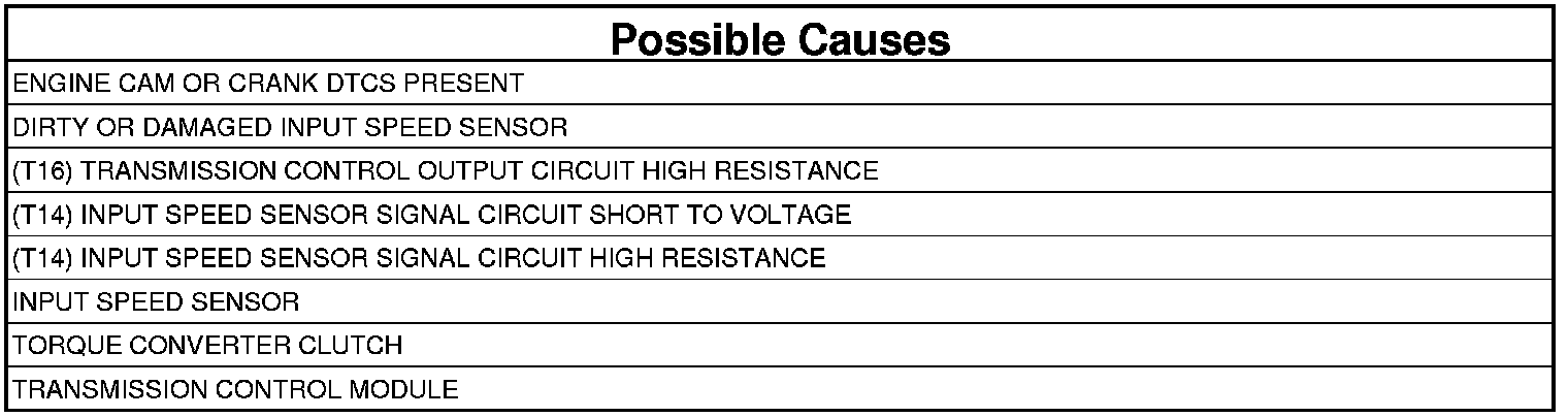 - Repair the (T14) Input Speed Sensor Signal circuit for an open or high resistance.