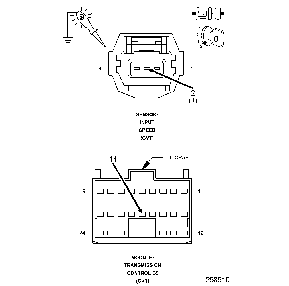 4. Using a 12-volt test light connected to ground, check the (T14) Input Speed Sensor Signal circuit in the TCM C2 harness connector.