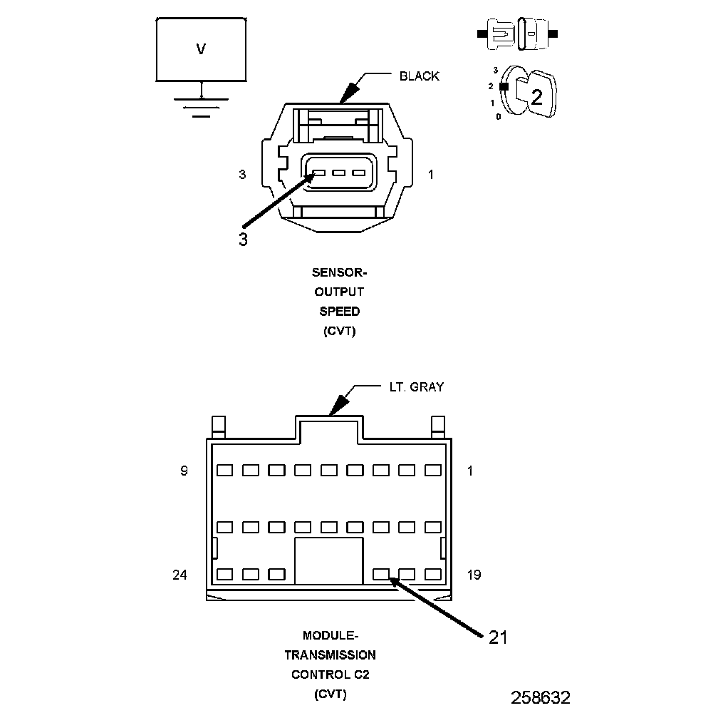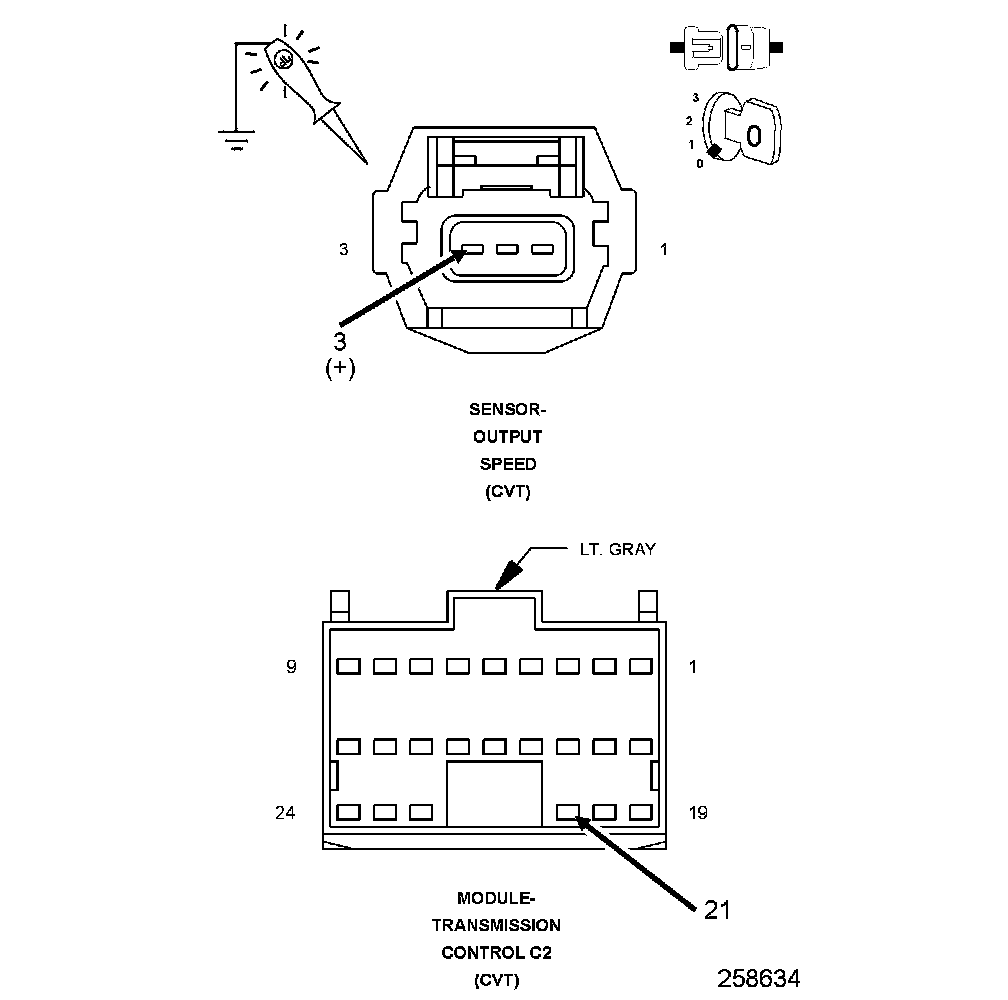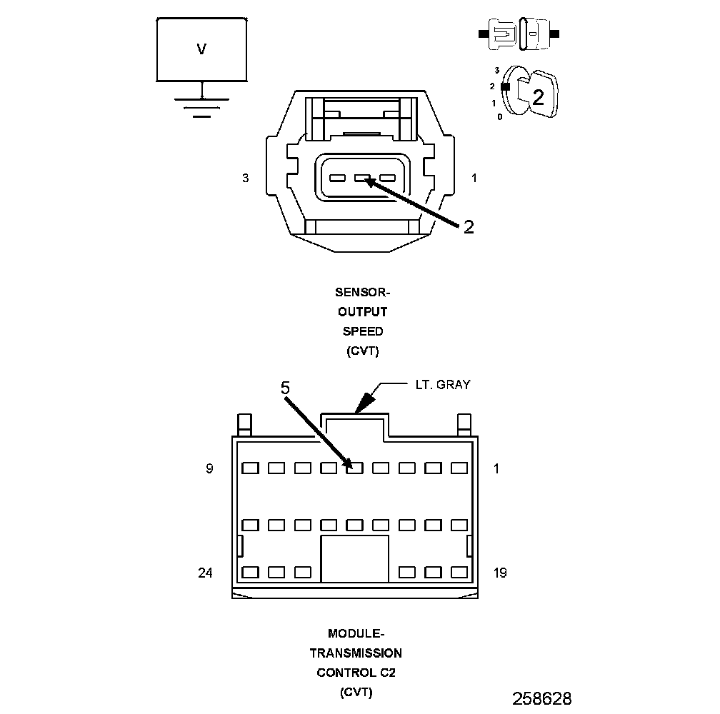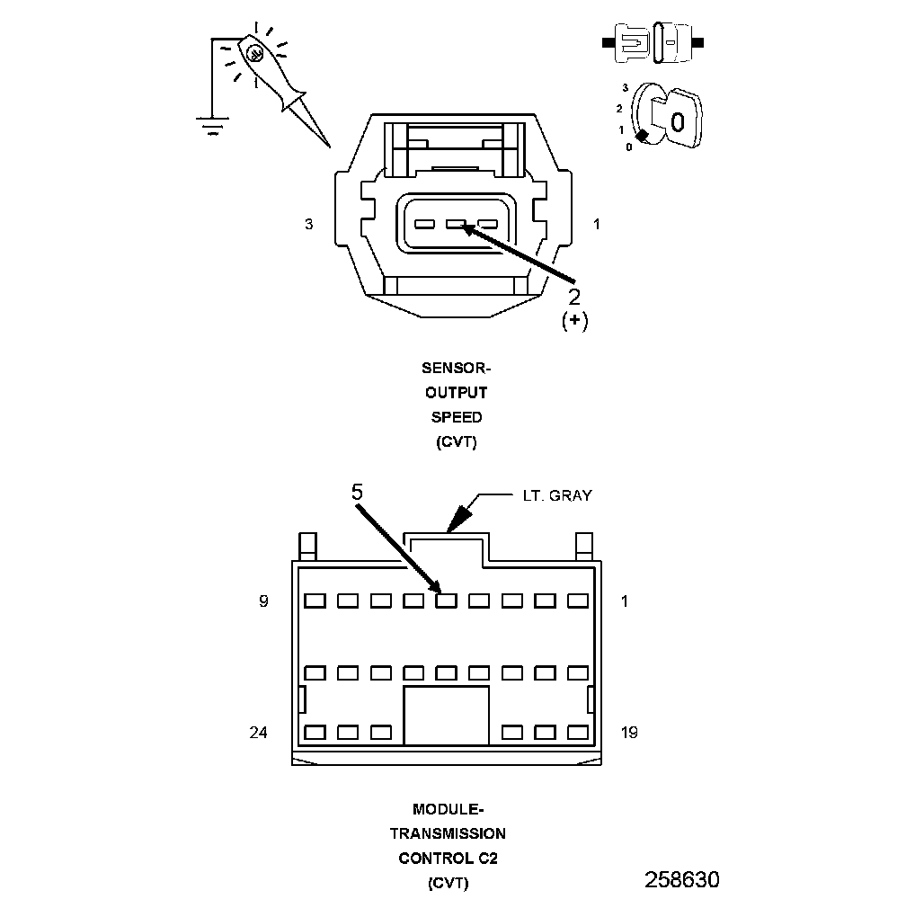 4. Using a 12-volt test light connected to ground, check the (T52) Output Speed Sensor Signal circuit in the TCM C2 harness connector.