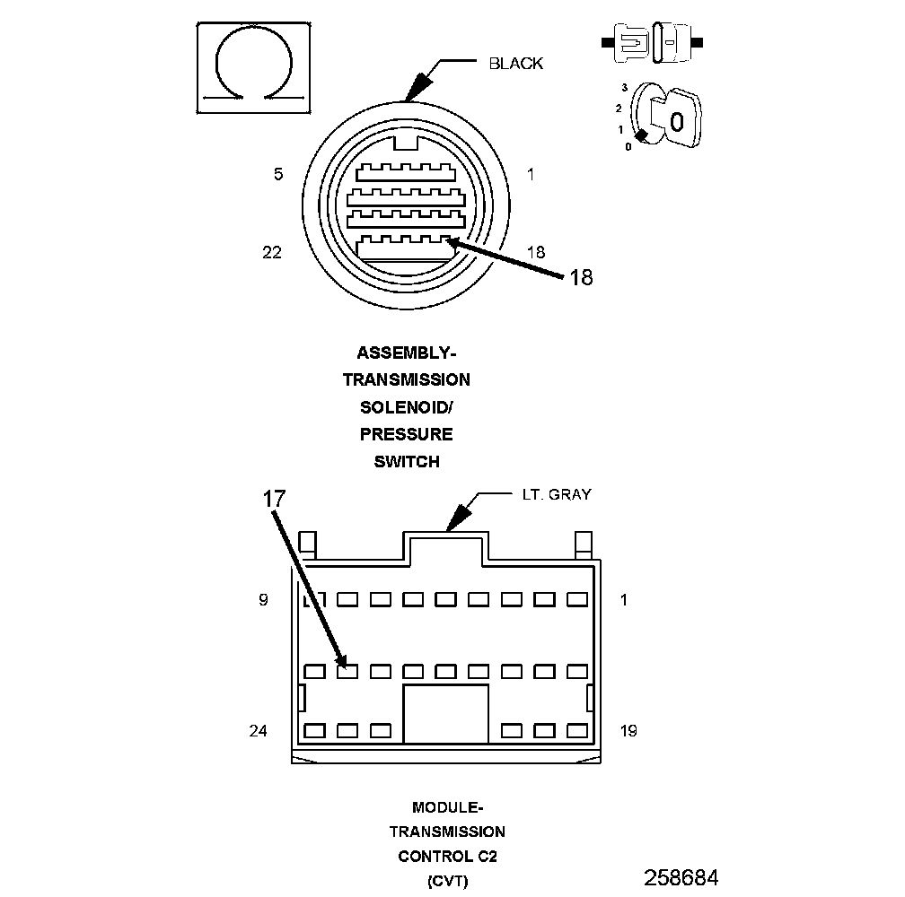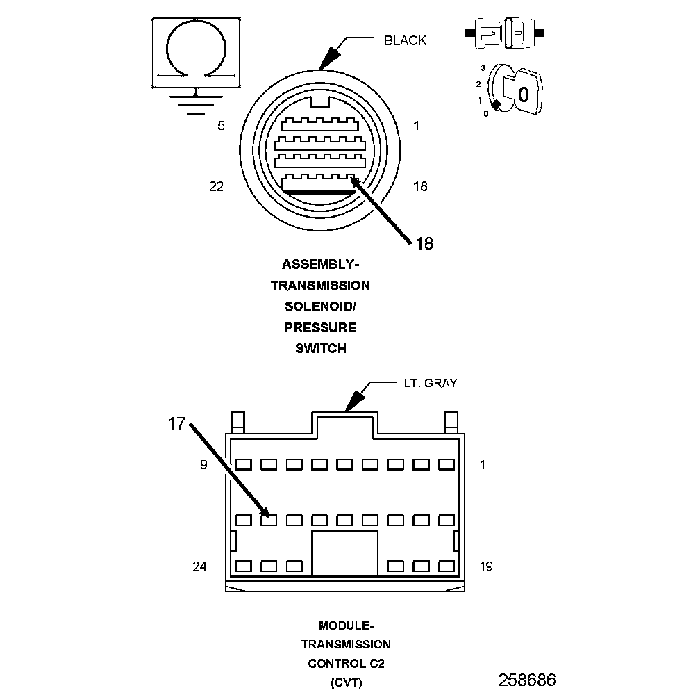 4. Connect a jumper wire between the (T21) Primary Pressure Sensor Signal circuit and the (T72) 5 Volt Supply circuit in the Transmission Solenoid/Pressure Switch Assembly harness connector.