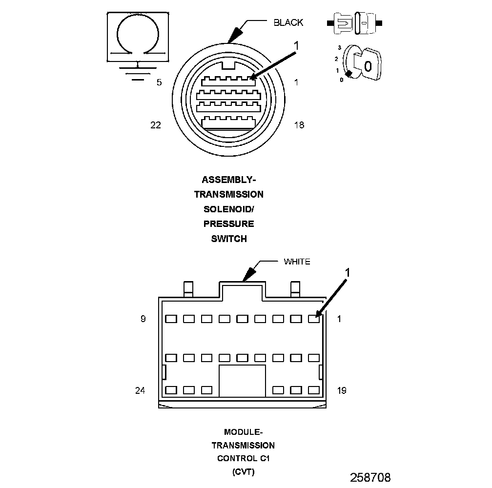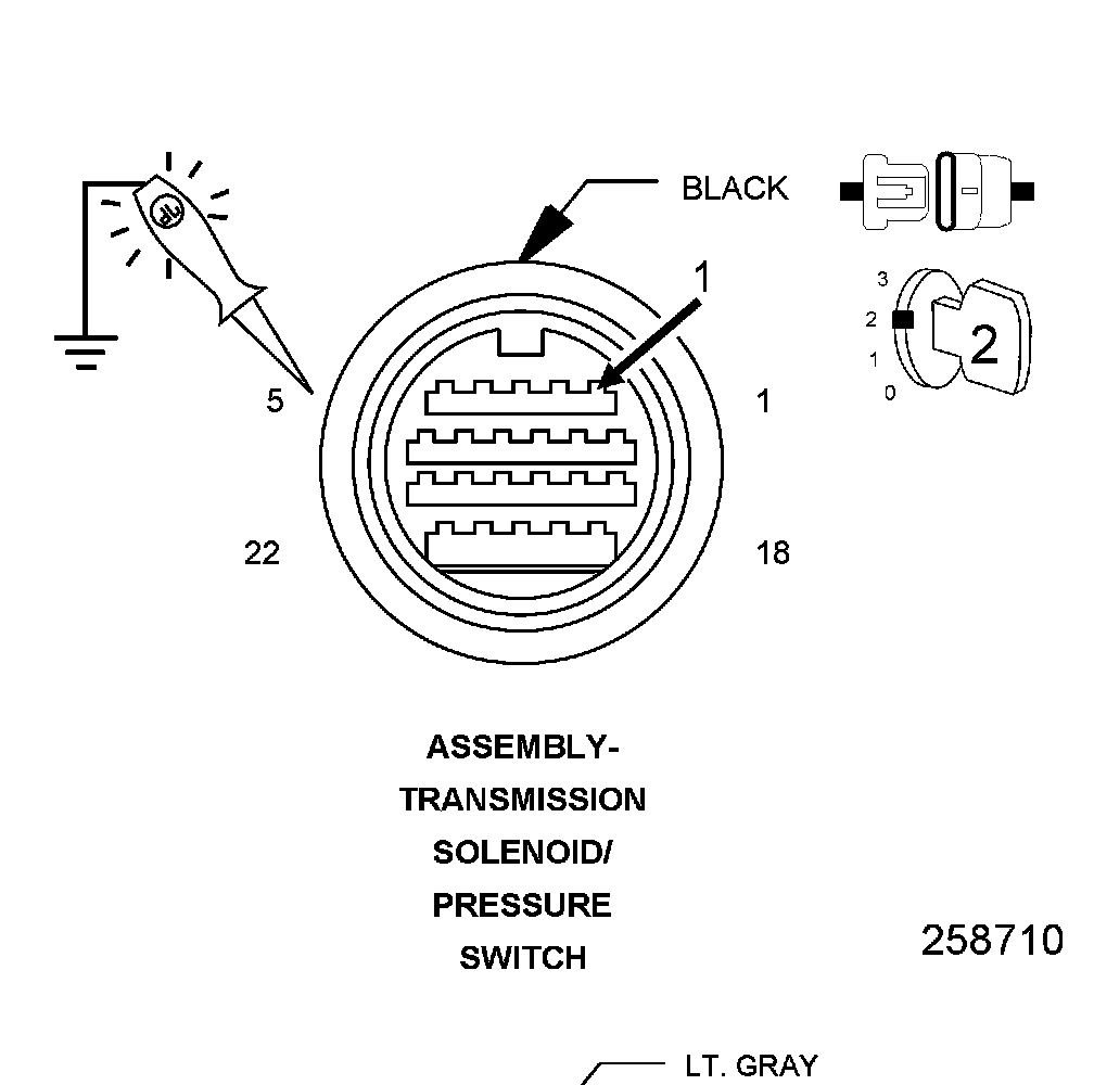 5. Using a test light connected to ground, check the (T20) Line Pressure Solenoid Control circuit in the Transmission Solenoid/Pressure Switch Assembly harness connector.