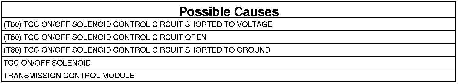 - Repair the (T60) TCC ON/OFF Solenoid Control circuit for a short to ground.