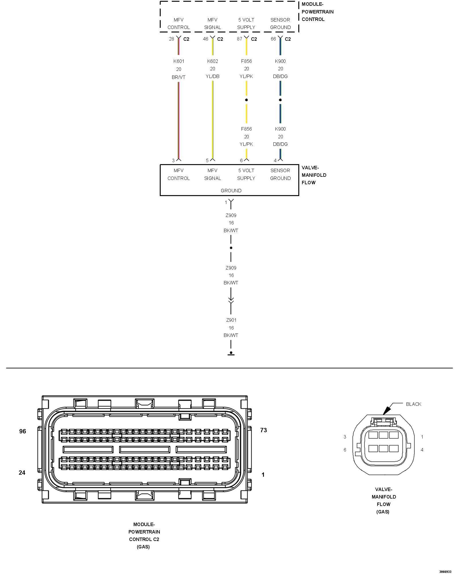 1. Using the wiring diagram/schematic as a guide, inspect the wiring and connectors between the Manifold Flow Valve and the Powertrain Control Module (PCM).