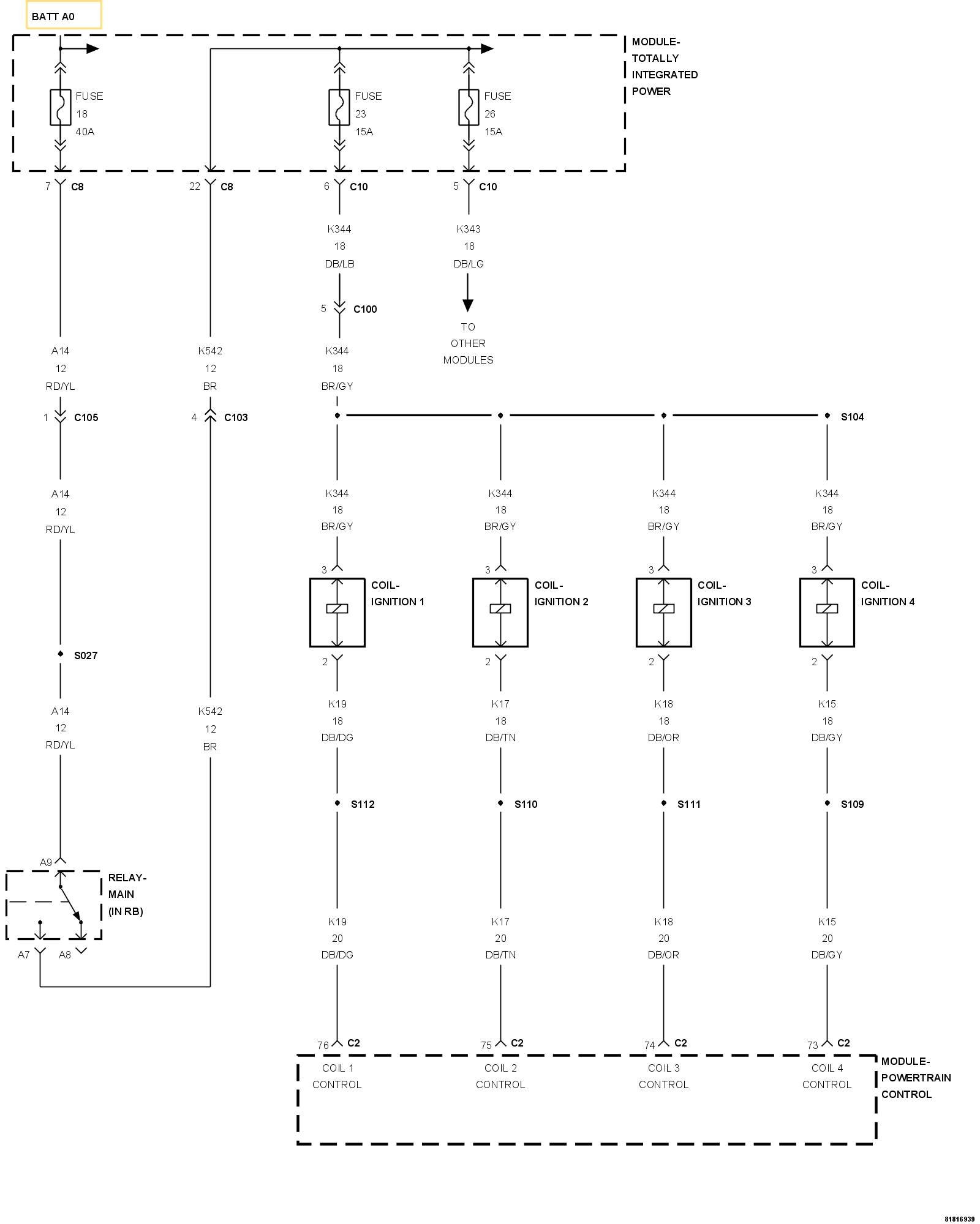4. Using a 12-volt test light connected to ground, check the (K344) Fused ASD Relay Output circuit in the Ignition Coil 4 harness connector.