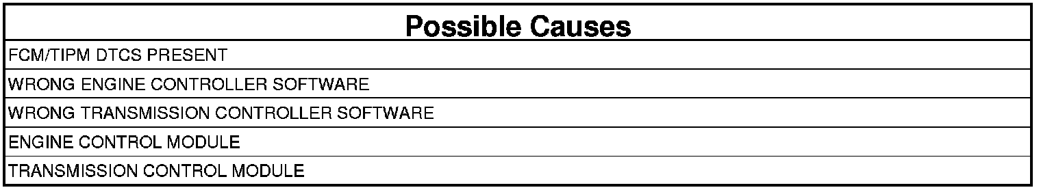 During the initial ignition on, the Transmission Control Module (TCM) receives the calibrated data from the Engine/Powertrain Control Module (ECM/PCM) over the CAN Bus and stores this information in the EEPROM of the TCM. During normal operation the TCM compares the stored data in the EEPROM to the transmitted data from the ECM/PCM. If the calibration data does not match the DTC will set and the MIL will illuminate after two consecutive failures.