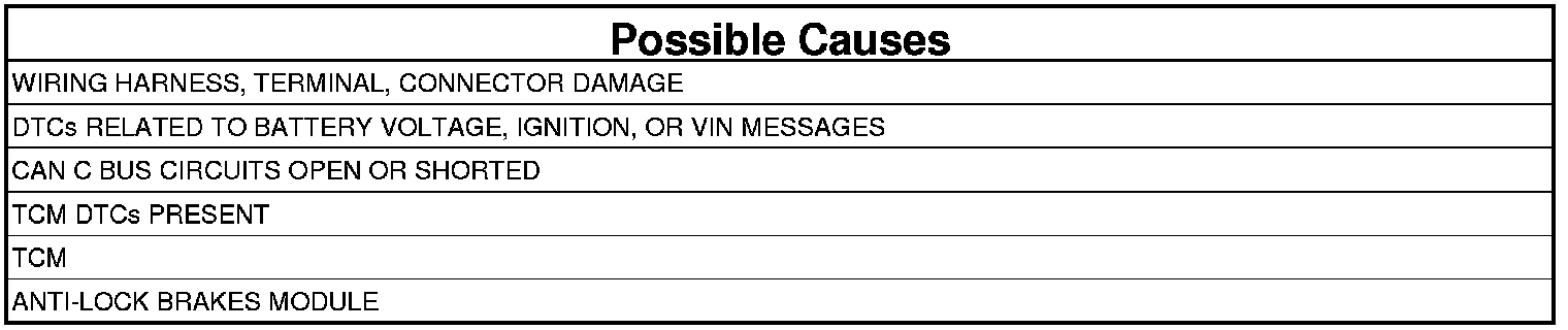 If the Anti-Lock Brakes Module detects bus messages from the Transmission Control Module (TCM) are of improper data length.