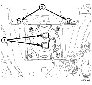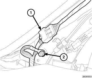 11. Install the ground connection and install the nut (2) to the A-pillar on the passenger side.