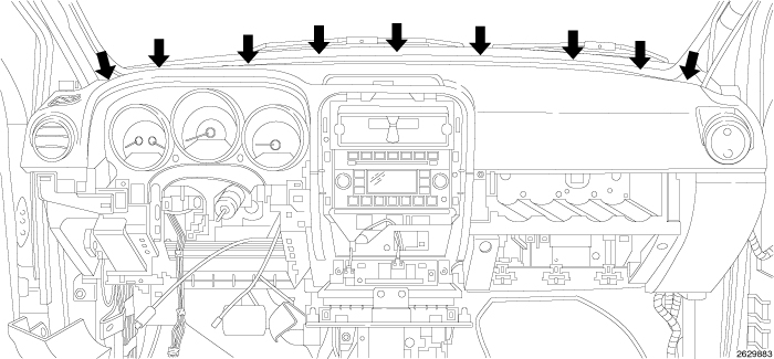 3. Seat the three retaining clips above the glove box, the two clips above the cluster and the one clip at the driver side HVAC outlet fully.