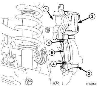 5. Remove the inboard brake pad (5) from the caliper adapter bracket (3).