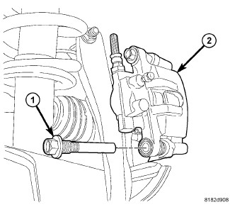 3. Remove the disc brake caliper (2) lower guide pin bolt (1).