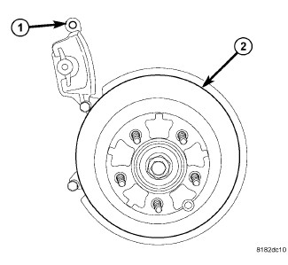 6. Remove the outboard brake pad (2) from the caliper (1) by prying the brake pad retaining clip over the raised area on the caliper. Slide the brake pad off of the brake caliper.