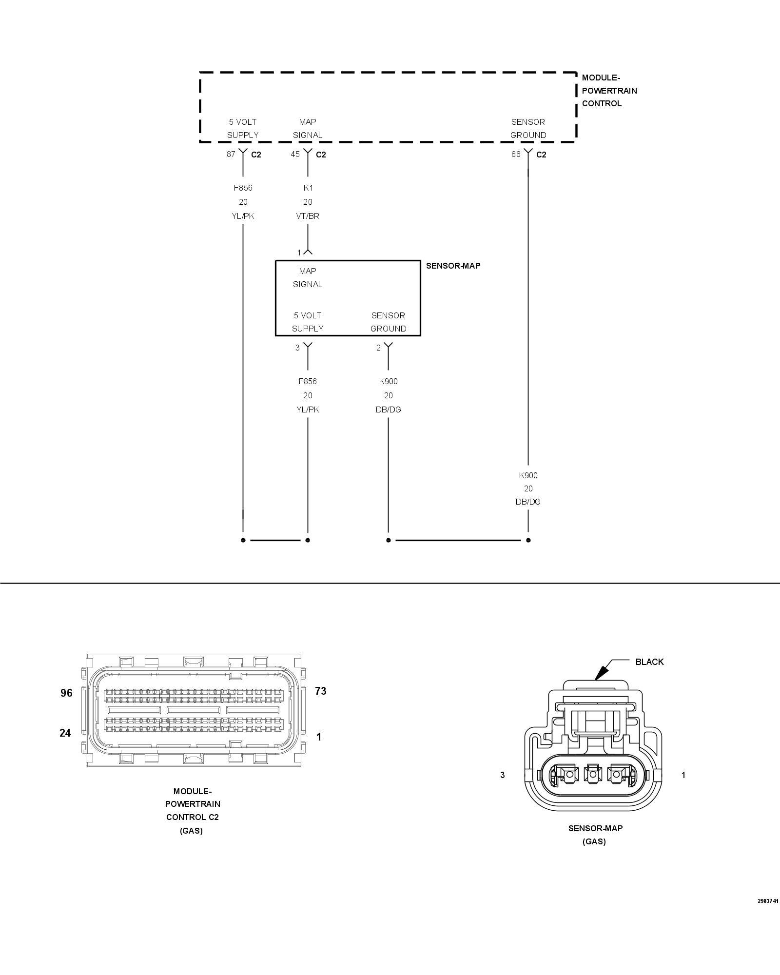 1. Using the wiring diagram/schematic as a guide, inspect the wiring and connectors between the MAP Sensor and the Powertrain Control Module (PCM).