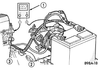 4. Connect the voltmeter (1) to measure between the battery (2) negative cable terminal clamp and a good clean ground on the engine block (3). Rotate and hold the ignition switch in the Start position. Observe the voltmeter. If the reading is above 0.2 volt, clean and tighten the battery negative cable eyelet terminal connection to the engine block. Repeat the test. If the reading is still above 0.2 volt, replace the faulty battery negative cable.