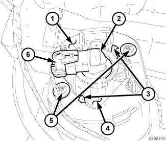 4. Reconnect the headlamp and dash wire harness connector (6) to the front fog lamp bulb (2) connector receptacle.
