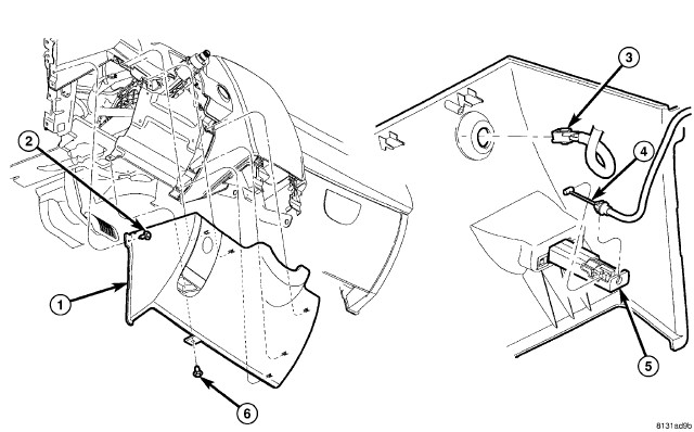 20. Install the screws (2 and 6) that secure the steering column cover (1) to the instrument panel. Tighten the screws securely.