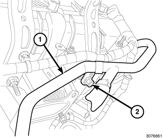 14. Remove the heater core return tube upper support bracket retaining nut (2) and reposition tube (1).