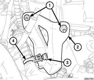 12. Unfasten the wire harness retainer (4) from the upper intake manifold support bracket (2) stud retainer (3).