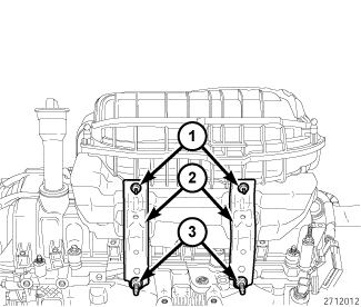 15. Remove the two nuts (1), loosen two stud retainers (3) and reposition the two upper intake manifold support brackets (2).