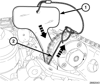 2. While holding the pawl off of the rack, push (10200-1) (1) into place between the cylinder head and the cam chain guide to force the rack and piston back into the tensioner body. The holder must remain in place during service to keep the rack and piston in the retracted position.