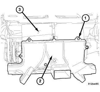 7. Position the front floor distribution duct (2) onto the air distribution housing (3).