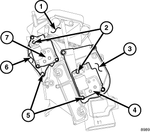 16. Position the blend door actuator mounting bracket (6) and the mode door actuator mounting bracket (3) onto the driver side of the air distribution housing (1).