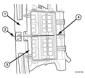 19. Position the mode door actuator (4) onto the air distribution housing. If necessary, rotate the actuator slightly to align the splines on the actuator output shaft with those on the mode door cam.