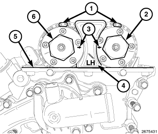 9. While maintaining this alignment, verify that the arrows on the left side cam phasers (3) point toward each other and are parallel to the valve cover sealing surface (5).