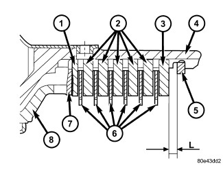 10. For transmissions using double sided friction discs, use a feeler gauge to determine the play "L" (Figure 4) at three points between the snap-ring (5) and outer multiple-disc (3).