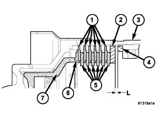 15. For transmissions using single sided friction discs, use a feeler gauge to determine the play "L" (Figure 5) at three points between the snap-ring (4) and outer multiple-disc (2).