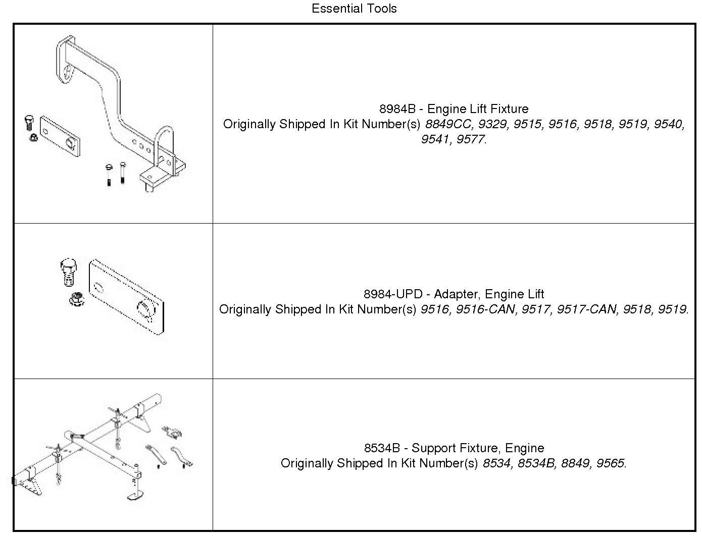 11. Using the Engine Lift Fixture (1), Engine Lift Adapter (2) and the Engine Support Fixture (3) lower the engine into position and remove.