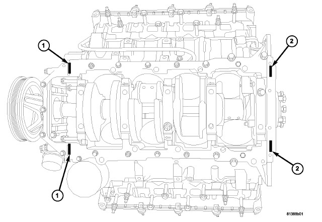 2. Apply Mopar(R) Engine RTV at the 4 T- joints (1,2).