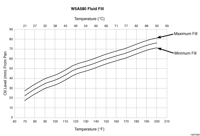 7. The transmission Oil Dipstick has indicator marks every 10 mm. With the transmission in PARK, determine the height of the oil level on the dipstick. Using the height, the transmission temperature and the transmission fluid graph, determine if the transmission oil level is correct.