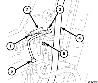 3. Connect the fuel filler tube vent line (3) at the filler tube (4) and the fuel tank vent steel line (6).