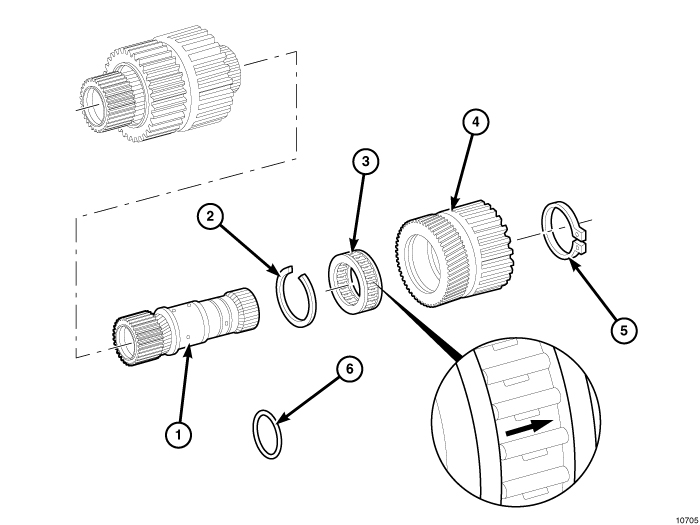 NOTE: On freewheeling F2 clutches (3) with plastic cages, the directional arrow on the side of the freewheeling clutch indicates the direction of installation into the sun gear (4). The brass top of the cage will be toward the snap-ring.