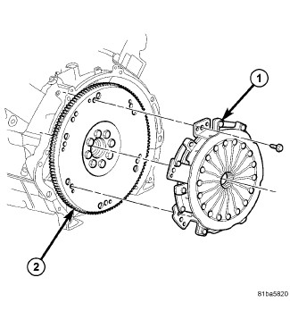 4. Install clutch assembly (1) onto the flywheel (2). Install clutch housing and transmission .