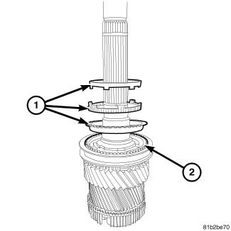 13. Install second gear synchronizer rings (1) on second gear (2).