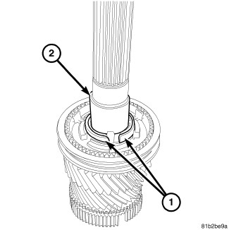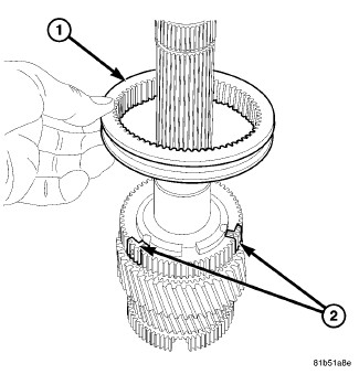 16. Install 1-2 synchronizer hub split rings (1) on mainshaft (2).