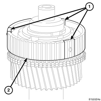 7. Install synchronizer detents (1) in 3-4 synchronizer hub (2).