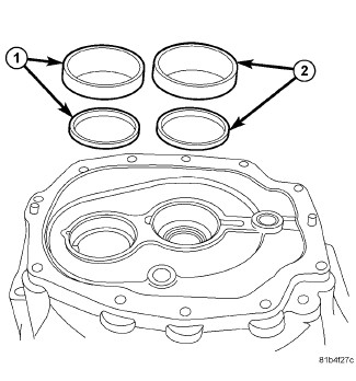 1. Install countershaft select shims and bearing cup (1) into adapter plate. Install mainshaft select shims and bearing cup (2) into adapter plate.