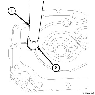 2. Install mainshaft bearing cup with Handle (1) and Installer (2).