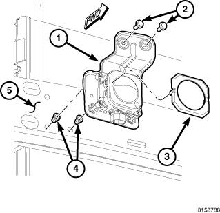 2. Install three new molded plastic ball socket clips into the adaptive speed control (also known as Adaptive Cruise Control/ACC) sensor mounting bracket (1) located below the right end of the front bumper support bar. The clips are installed from the back side of the bracket by rotating them clockwise.