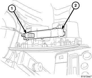 6. Remove the LED lamp (2) from the center console by flexing the lock tabs on the unit.
