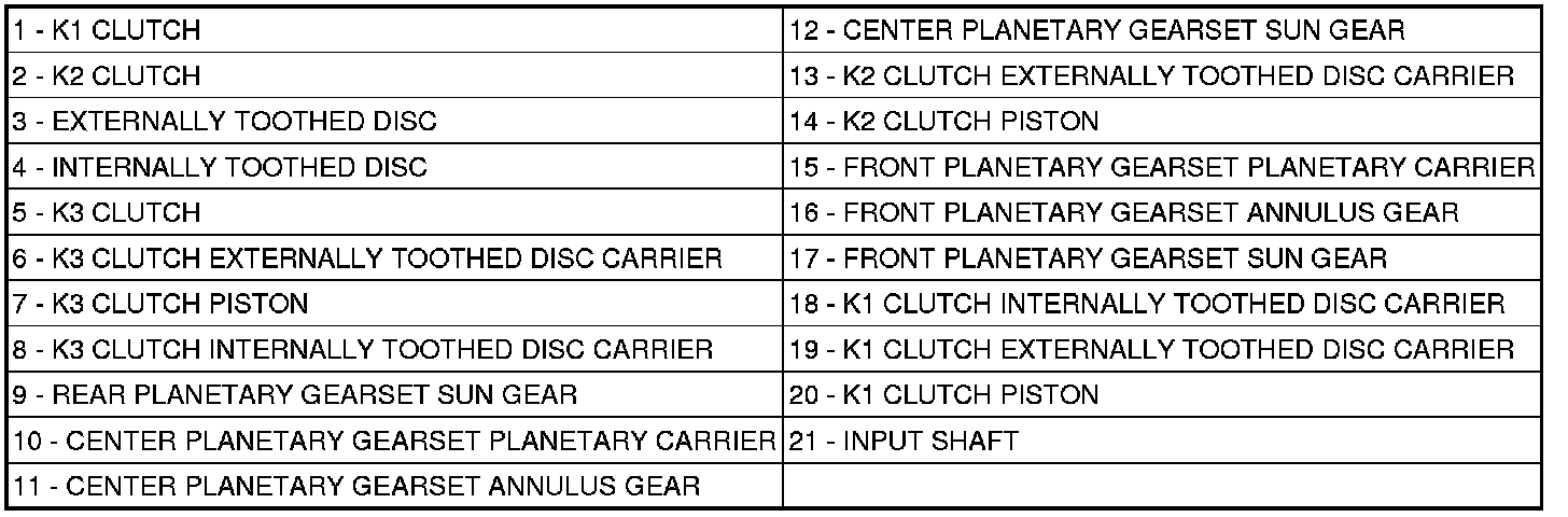 If the piston (20) on multi-plate clutch K1 (1) is subjected to oil pressure, it presses the internal and external discs of the disc set together. The sun gear (17) is locked with the planetary carrier (15) via the externally toothed disc carrier (19) and the internally toothed disc carrier (18). The front planetary gear set is thus locked and turns as a closed unit.